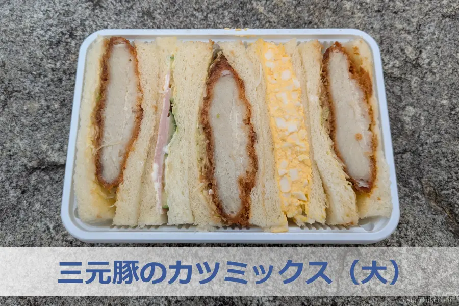三元豚のカツは3個、他に玉子サンドとハムサンドがミックスになっています。