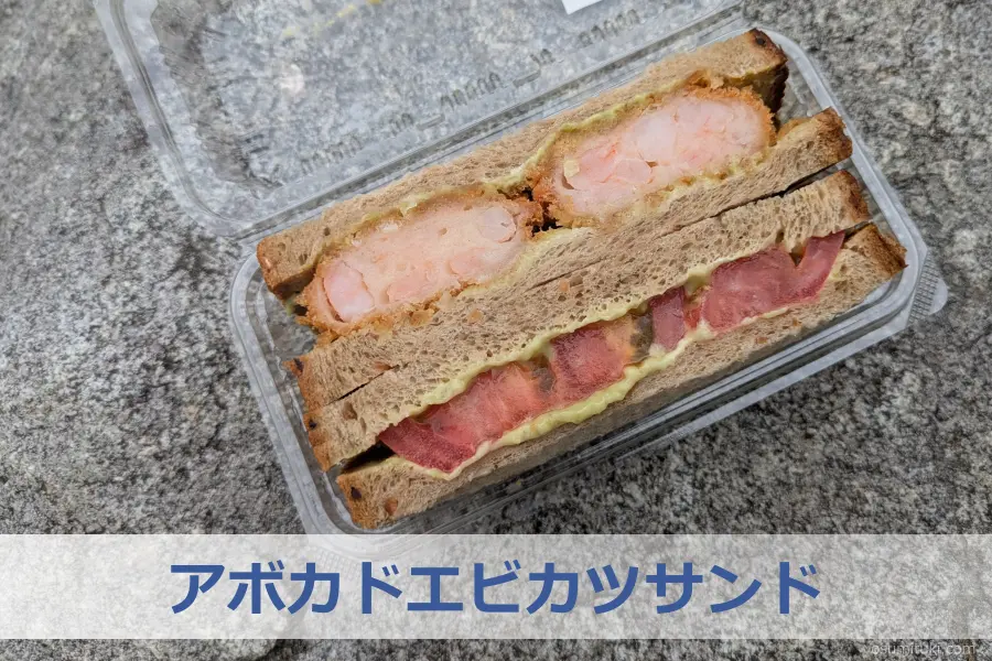海老たっぷりの海老カツがサンドされています。半分はトマトのサンドイッチです。
