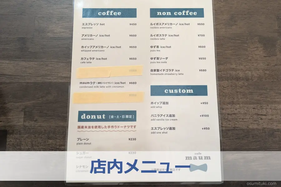 メニューを見てみると「エスプレッソ・アメリカーノ・カフェラテ・ルイボスティー・ゆず茶」などのドリンクがメインです。週末(公式SNSでは土日)には国産米油で揚げた手作りドーナツもあります。