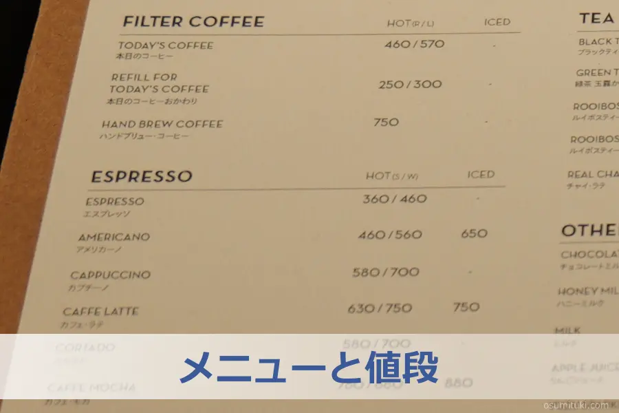 値段は360円からですがエスプレッソシングルがその値段で、カフェラテはシングルで630円です。一人あたりの費用の予算は500円~1000円程度考えておいてください。
