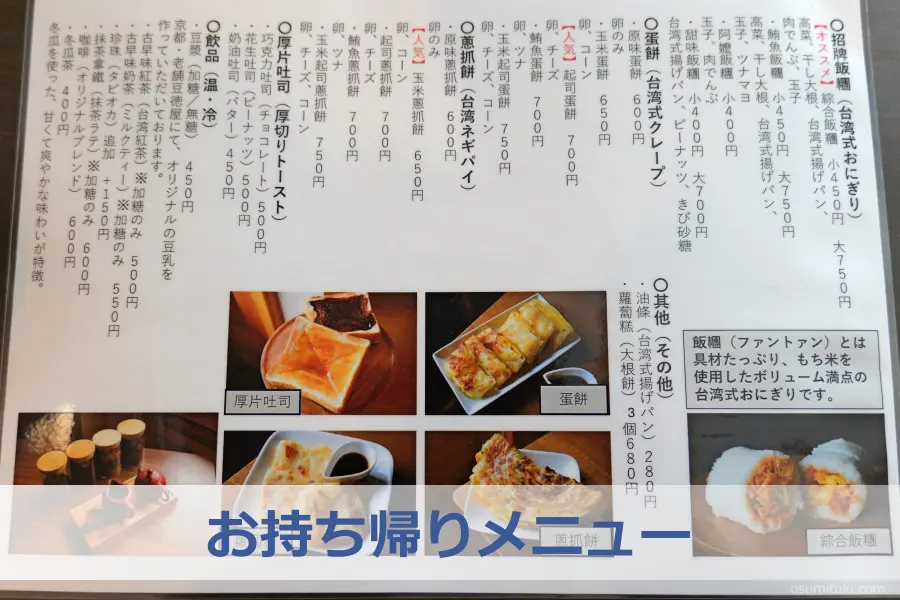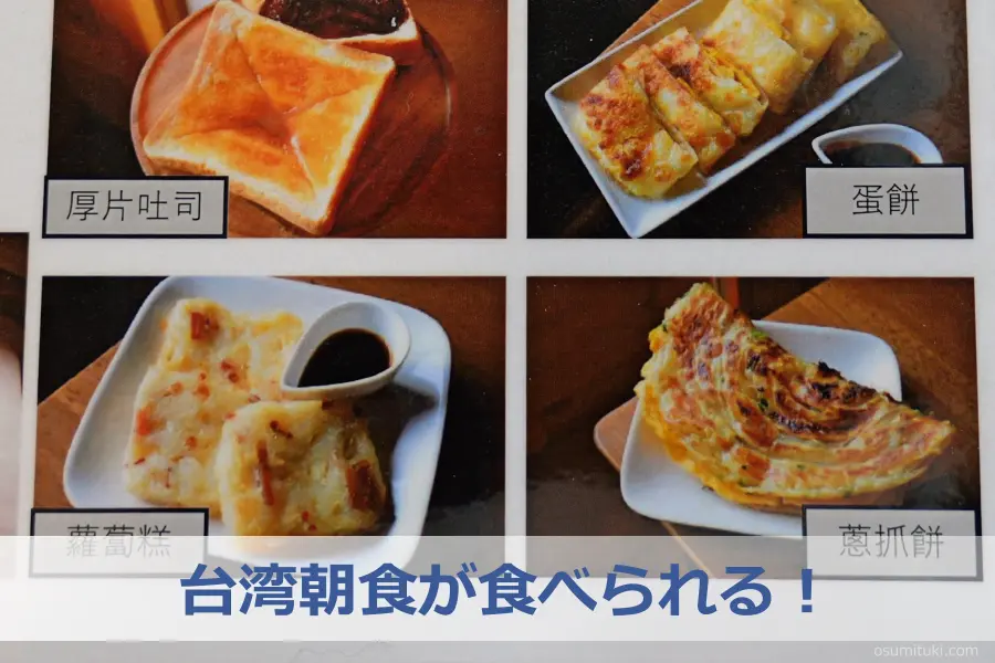 台湾式おにぎり(飯糰)や台湾式クレープ(蛋餅)に台湾ネギパイ(葱抓餅)などの台湾朝食がテイクアウトできます。また、三条会商店街は外国人観光客も見掛ける土地柄なので厚切りトースト(厚片吐司)も販売されていました。