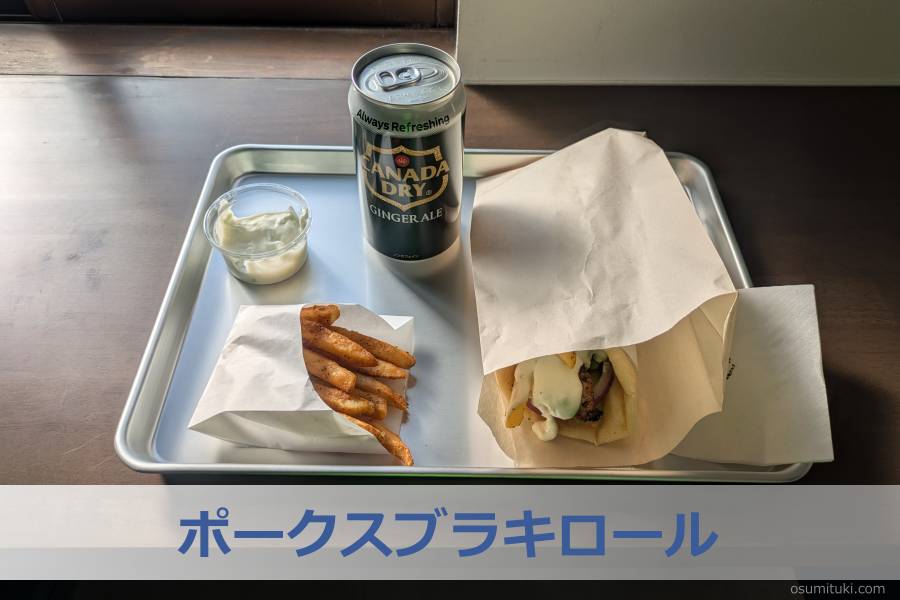 ポークスブラキロールは単品で、それにポテトフライとドリンクを追加料金でセットできるメニューがあったのでそれも注文しました。