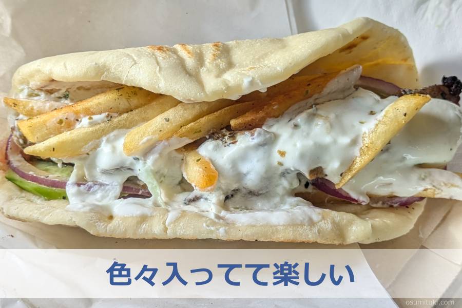 よくよくメニューを見ると、お肉はギリシャの代表的な料理「スブラキ(串焼き)」が入っているようです。また、これは予測できなかったのですがフライドポテトも野菜やスブラキと一緒に巻いて食べるお料理とのことでした。