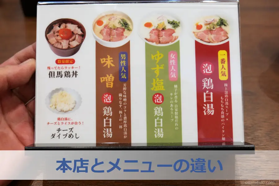 オープン後に確認したところ、ベースの「泡鶏白湯ラーメン」は変わらず。2024年夏限定販売だった「ゆず塩泡白湯」がレギュラー化(本店も同様)。コロナ禍頃に冬期限定から始まった「味噌泡白湯」もありました。本店にあった魚介鶏白湯のラーメンはありません。