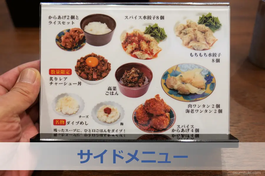 ラーメンだけでは物足りない方にはサイドメニューの注文がおすすめです。サイドメニューには「炙りレアチャーシュー丼・但馬鶏丼・肉生姜めし・水餃子・肉ワンタン・唐揚げ」などがあります。