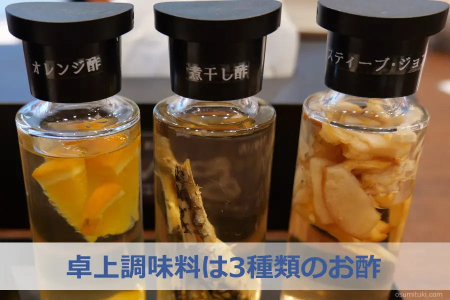 種類は「オレンジ酢、煮干し酢、スティーブ・ジョブ酢」で、ひとつ某有名IT企業に怒られそうなお酢があります。ちなみに本店では「オレンジ酢、煮干し酢、エキゾチック酢」がありましたが、卓上調味料もリニューアルしているようです。