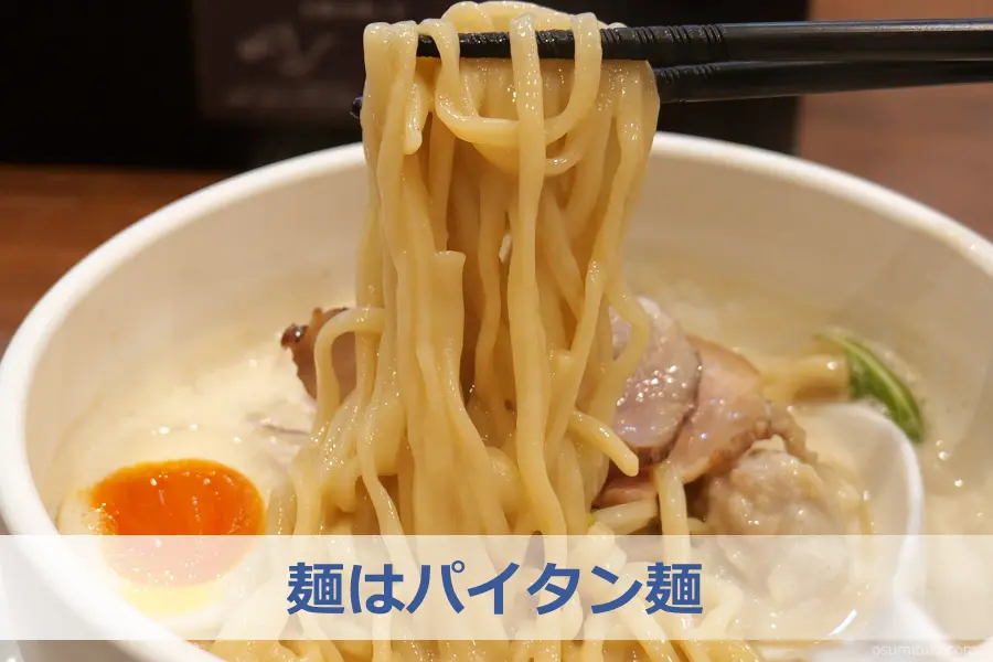 麺は太さは太めの平打ち麺で、麺は「パイタン麺」と表記されています。鶏白湯専門店なので白湯(パイタン)に合う麺ということだと思います。切刃番手でいえば15番くらいかなと思われました。