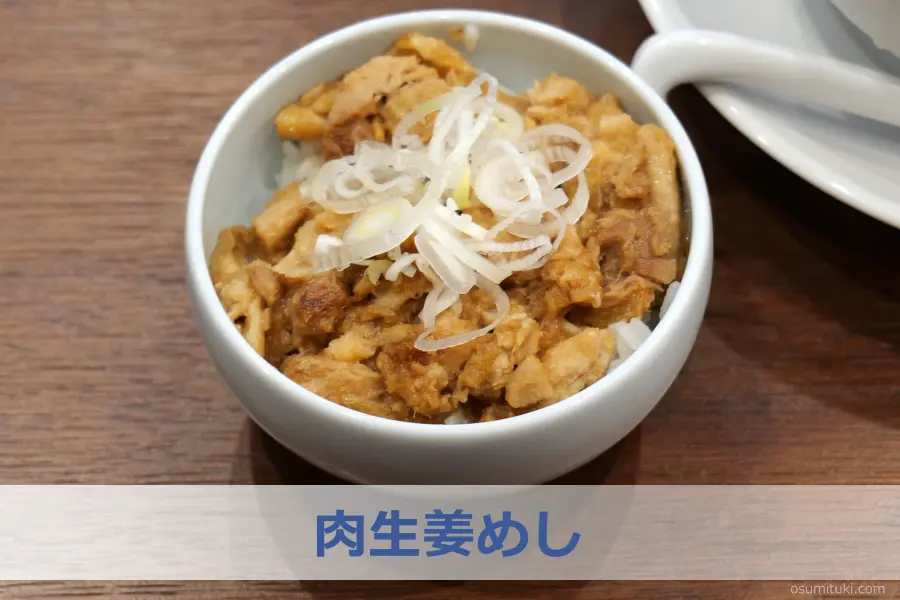 肉生姜めしは味付けがやや辛めの鶏肉と鶏皮の丼ものです。
