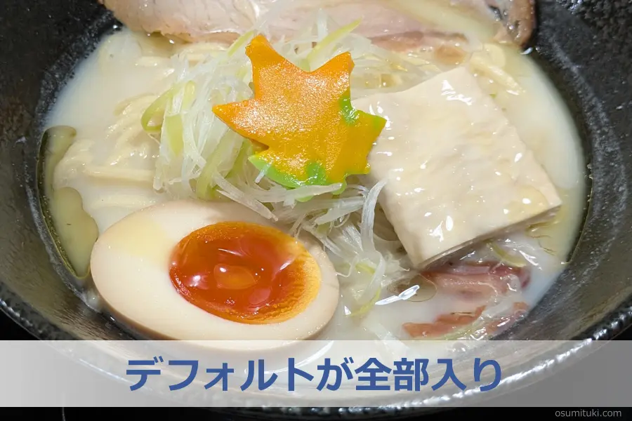 魚介出汁に京都らしい白味噌を独自にブレンドしたスープは甘みもありクリーミーです。見た感じは京都らしさを感じる紅葉型のお麩や湯葉が入っています。青ネギではなく白ねぎなのが京都っぽくはないものの色合いなどを考慮すれば白ねぎのほうが合いますね。