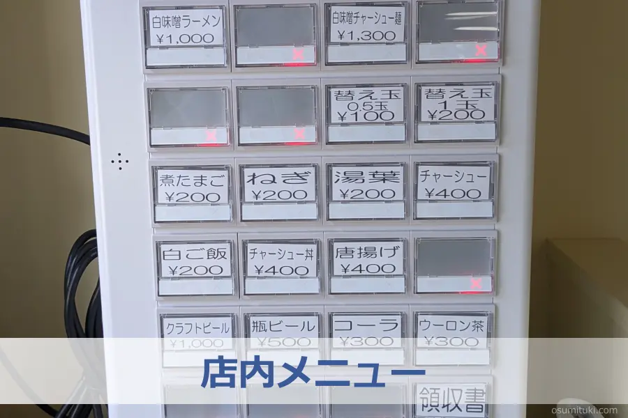 ラーメンは白味噌ラーメンとそのチャーシュー麺と清い構成。サイドメニューにチャーシュー丼と唐揚げなどがありました。