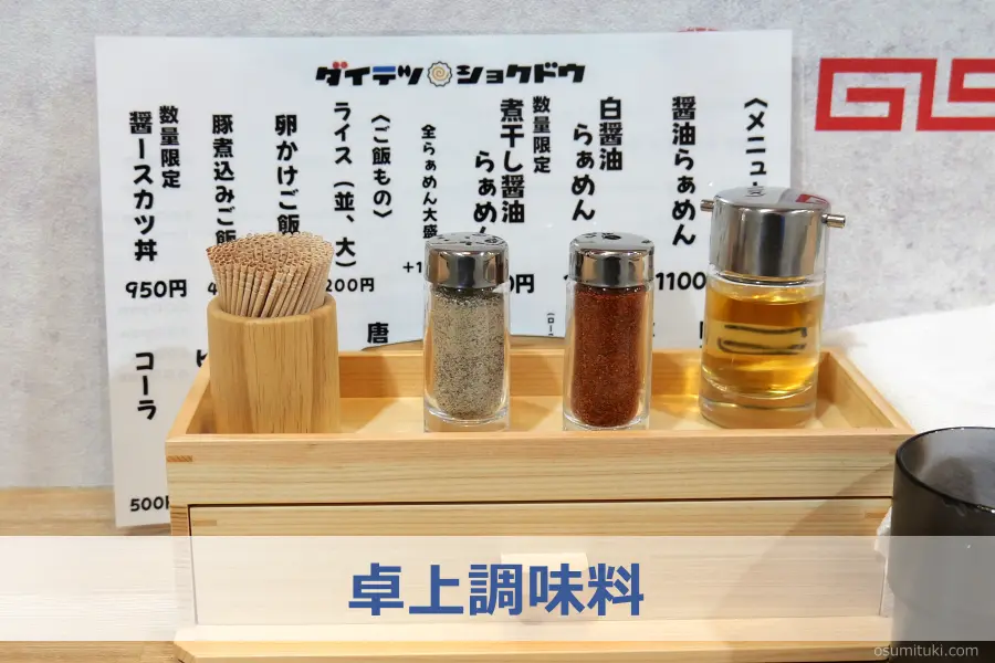卓上調味料は「コショウ・一味・お酢」の3種類です。