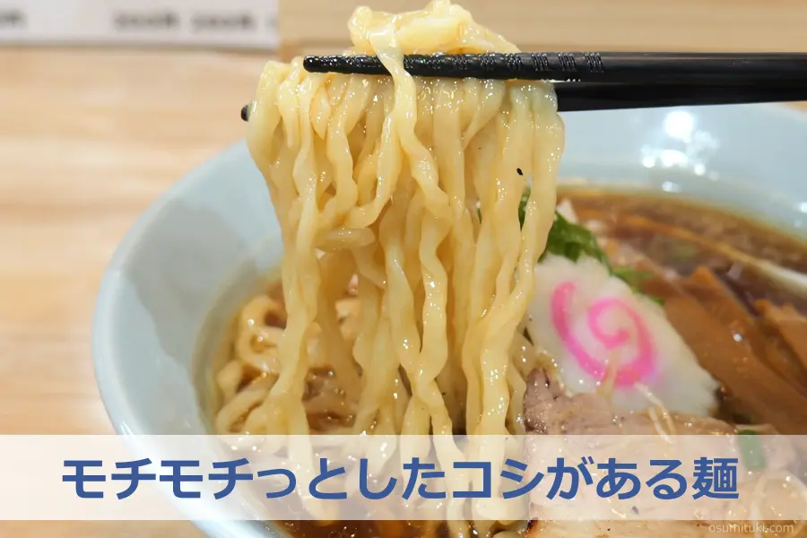 太めの平打ち手もみ麺で、多加水でモチモチっとしたコシがある麺です。いわゆる喜多方ラーメンの麺と言えます。