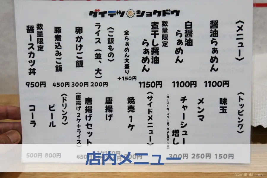 メニューを見てみると「醤油ラーメン・白醤油ラーメン・煮干し醤油ラーメン・卵かけご飯・豚煮込みご飯・シュウマイ・唐揚げ」などをお店で食べることができます。テイクアウトの記載はありませんでした。