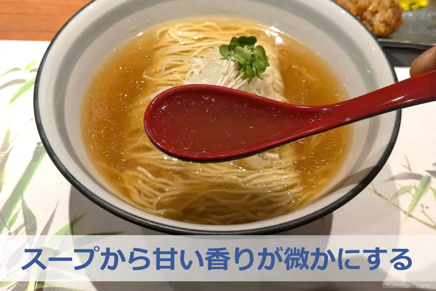 スープは「鶏ガラ」がスープベース(出汁)。味付け(タレ)は醤油で辛さ控えめの京都ラーメンらしい味わい。表面には香味油(鶏油=チーユ)が浮かんでいますがスープからは柑橘系(たぶん柚子)の甘い香りが微かに感じられて、他ではなかなか味わえない風味の美味しいスープになっています。