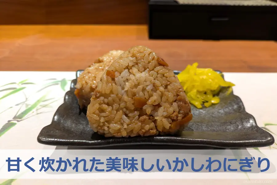 甘く炊かれた美味しいかしわにぎりが2個にお漬物まで付いていて、祇園とは思えない破格のお値段です。