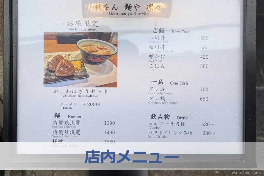近くには有名店(いづう・ぎょうざ歩兵・挽肉と米 等)が多い通りで外国人観光客も多いところですが、祇園北側の中でも日本人の利用者が比較的多い通りです。今回紹介する「祇をん 麺や 凛々」でもお客さんは日本の方が多いそうです。そういったこともあるのでしょう、メニューはきちんと日本語で書かれていますし、昼限定のセットメニューは破格の200円で「かしわにぎり(2個)」が一緒に注文できるなど日本人向けのラーメン店と感じるお店です。