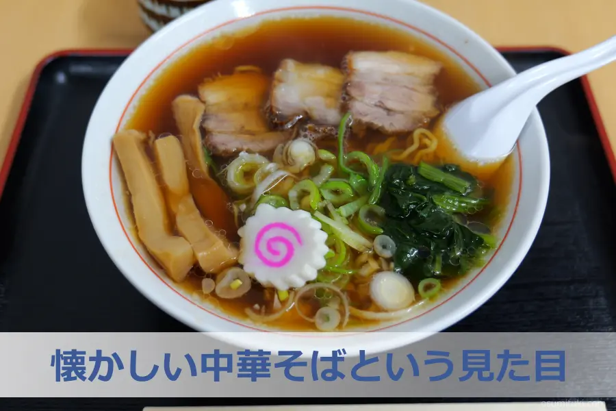見た目は白色のラーメンどんぶりに「焼豚3枚・メンマ・白ねぎ・ナルト・ほうれん草」がトッピングされていて懐かしい中華そばという見た目です。