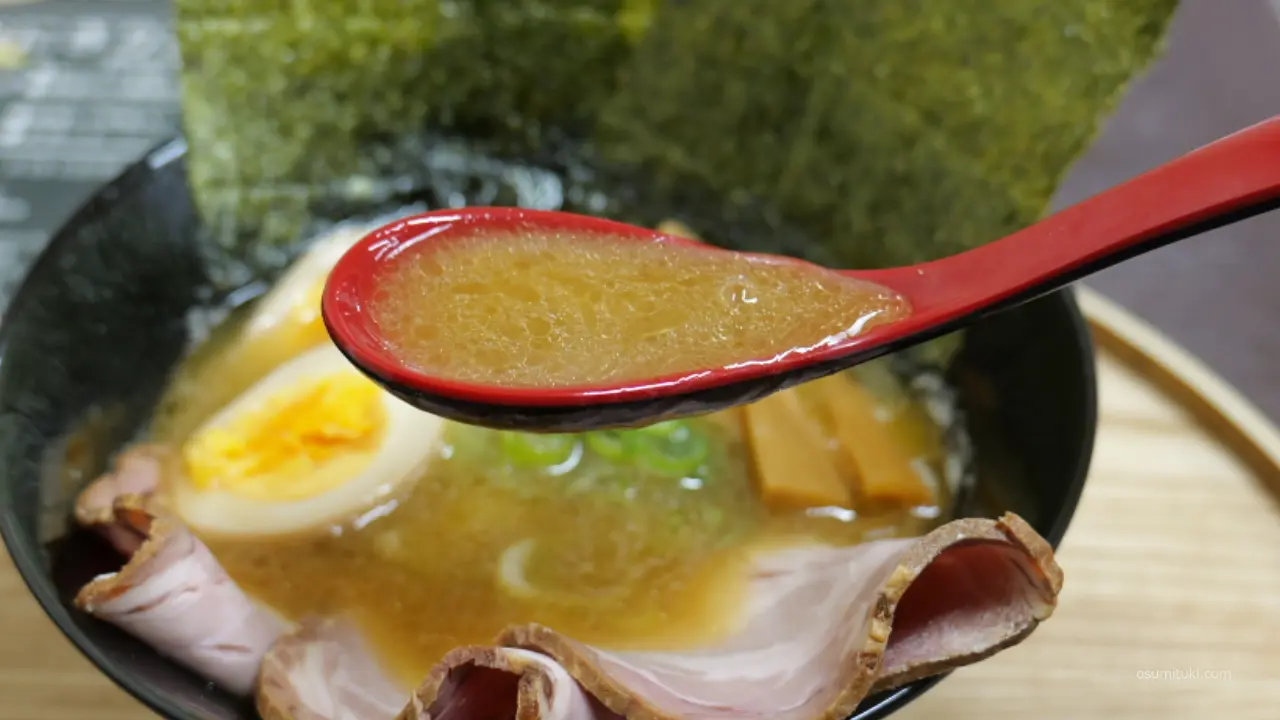 スープは「豚骨」がスープベース(出汁)。味付け(タレ)は醤油で一般的な家系より辛さ控えめの仕上がりです。表面には香味油(鶏油=チーユ)が浮かんでいて家系らしい香りがします。